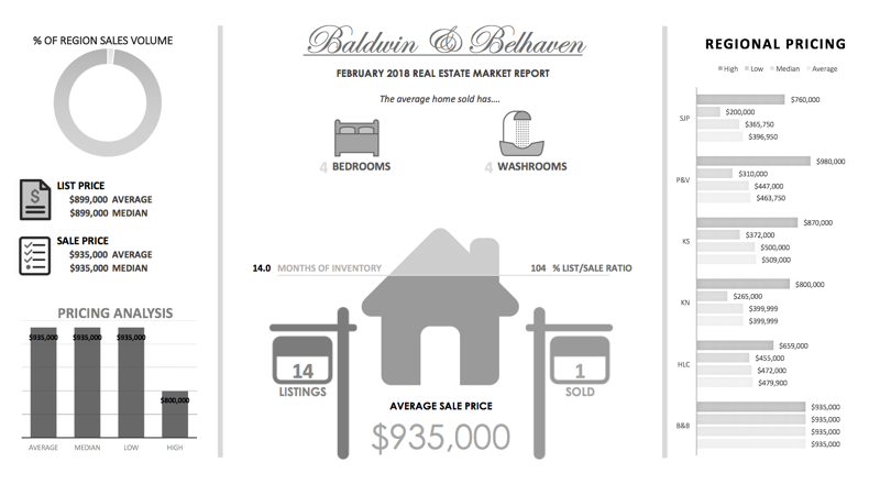 Baldwin & Belhaven real estate market infographic The average size of a home in Baldwin & Belhaven has 4 bedrooms and 4 washrooms. $899,000 is the average list price of a home in Baldwin & Belhaven while the average sale price is . There are currently 14 homes for sale in Baldwin & Belhaven home sold in the area, meaning that there are 14.0 months of real estate inventory available in Baldwin & Belhaven . Baldwin & Belhaven s list price to sale price ratio was 104 %. Baldwin & Belhaven s highest real estate sale price for the month was $935,000 . Baldwin & Belhaven s lowest real estate sale price for the month was $935,000 . Baldwin & Belhaven median home sale price for the month was $935,000 . Baldwin & Belhaven average real estate taxes for the month were $6,219 Baldwin & Belhaven average days on market for a property listed for sale was 15 days.