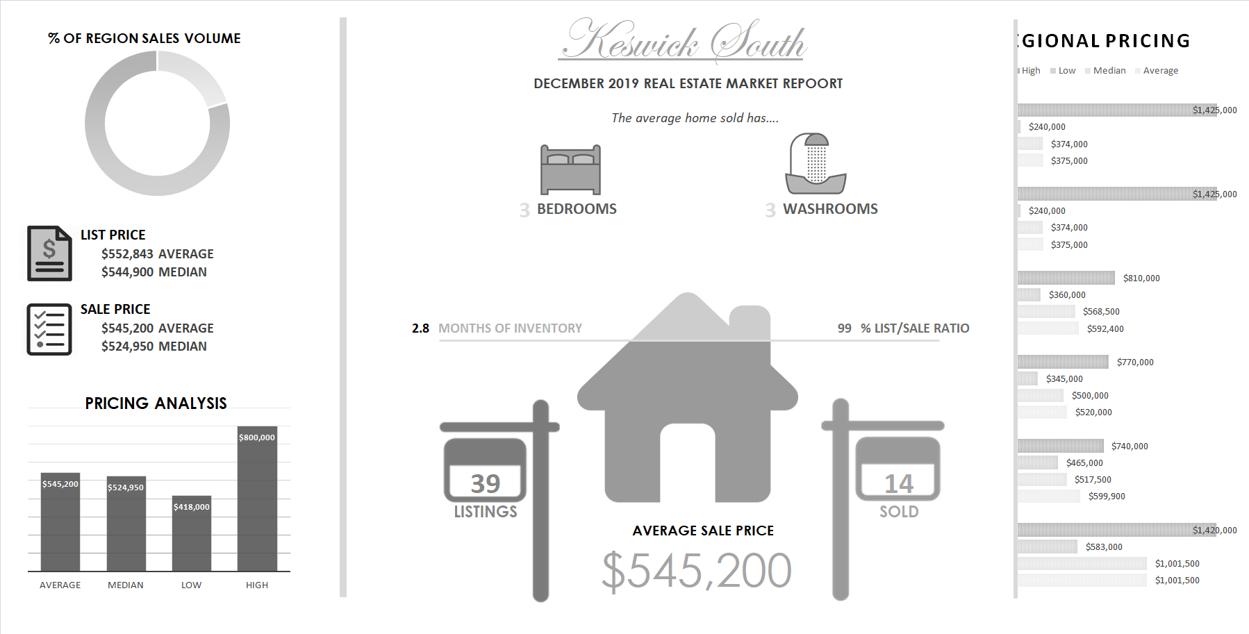 Keswick South Infographic - The average size of a home in Keswick South has 3 bedrooms and 3 washrooms. $552,843 is the average list price of a home in Keswick South.T here are currently 39 homes for sale in Keswick South. Only 55 homes sold meaning that there is only 2.8 months of real estate inventory avalible in Keswick South. Keswick South highest sale price for the month was $545,200. Keswick South lowest real estate sale price was $600,000. Keswick South Median home sale price for the month was $561,257. Keswick South average real estate taxes for the month were $3,668. Keswick South average days on market for a property listed for sale was 33.