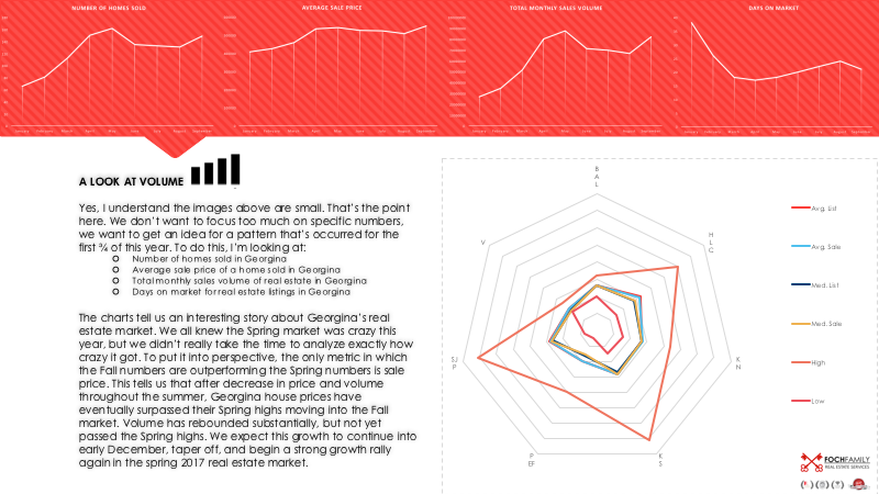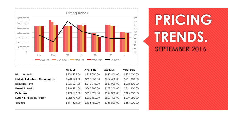 The charts tell us an interesting story about Georgina’s real estate market. We all knew the Spring market was crazy this year, but we didn’t really take the time to analyze exactly how crazy it got. To put it into perspective, the only metric in which the Fall numbers are outperforming the Spring numbers is sale price. This tells us that after decrease in price and volume throughout the summer, Georgina house prices have eventually surpassed their Spring highs moving into the Fall market. Volume has rebounded substantially, but not yet passed the Spring highs. We expect this growth to continue into early December, taper off, and begin a strong growth rally again in the spring 2017 real estate market.