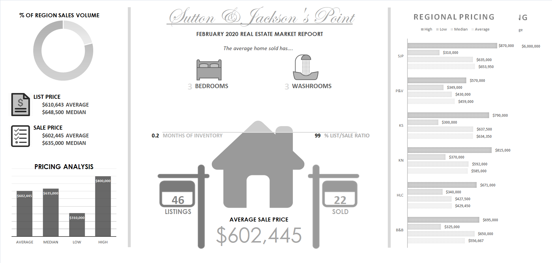 Sutton & Jackson's Point Infographic - The average size of a home in Sutton & Jackson's Point has 3 bedrooms and 3 washrooms. $610,643 is the average list price of a home in Sutton & Jackson's Point. There are currently 46 homes for sale in Sutton & Jackson's Point. Only 9 homes sold meaning that there is only 0.2 months of real estate inventory avalible in Sutton & Jackson's Point. Sutton & Jackson's Point LIST/SALE RATIO was 99%. Sutton & Jackson's Point highest sale price for the month was $602,445. Sutton & Jackson's Point lowest real estate sale price was n/a. Sutton & Jackson's Point Median home sale price for the month was $612,371. Sutton & Jackson's Point average real estate taxes for the month were $3,989. Sutton & Jackson's Point average days on market for a property listed for sale was 25.