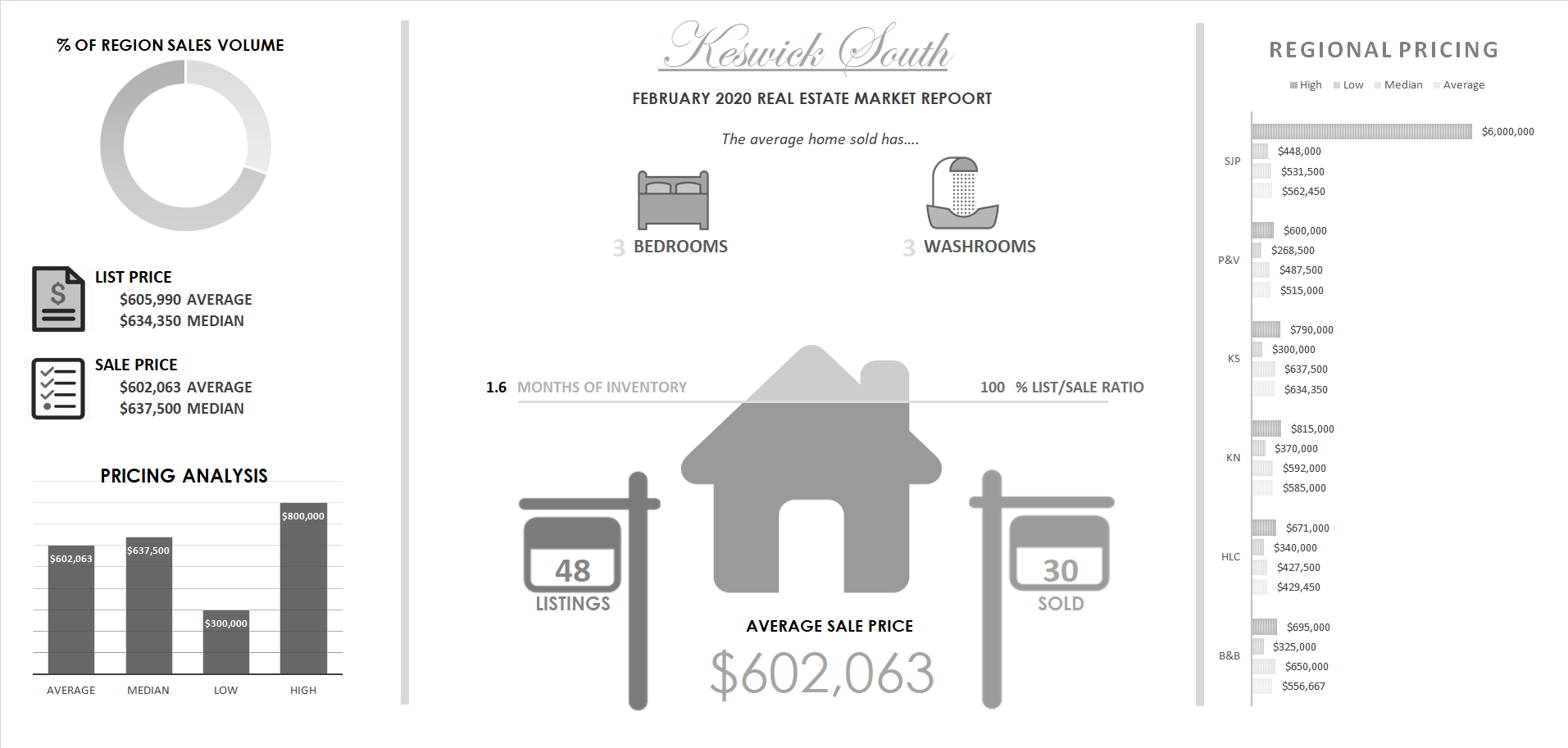 Keswick South Infographic - The average size of a home in Keswick South has 3 bedrooms and 3 washrooms. $605,990 is the average list price of a home in Keswick South. There are currently 48 homes for sale in Keswick South. Only 55 homes sold meaning that there is only 1.6 months of real estate inventory avalible in Keswick South. Keswick South lowest sale price for the month was $602,063. Keswick South highest real estate sale price was $715,000. Keswick South Median home sale price for the month was $605,990. Keswick South average real estate taxes for the month were $3,911. Keswick South average days on market for a property listed for sale was 11.